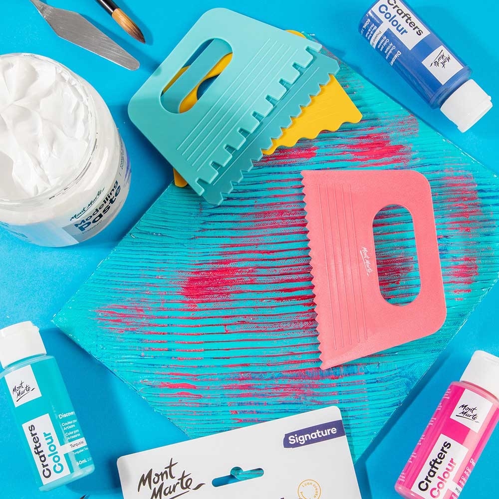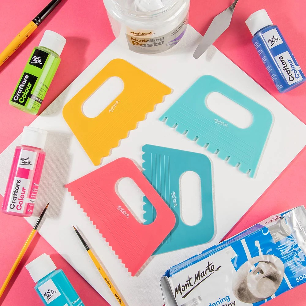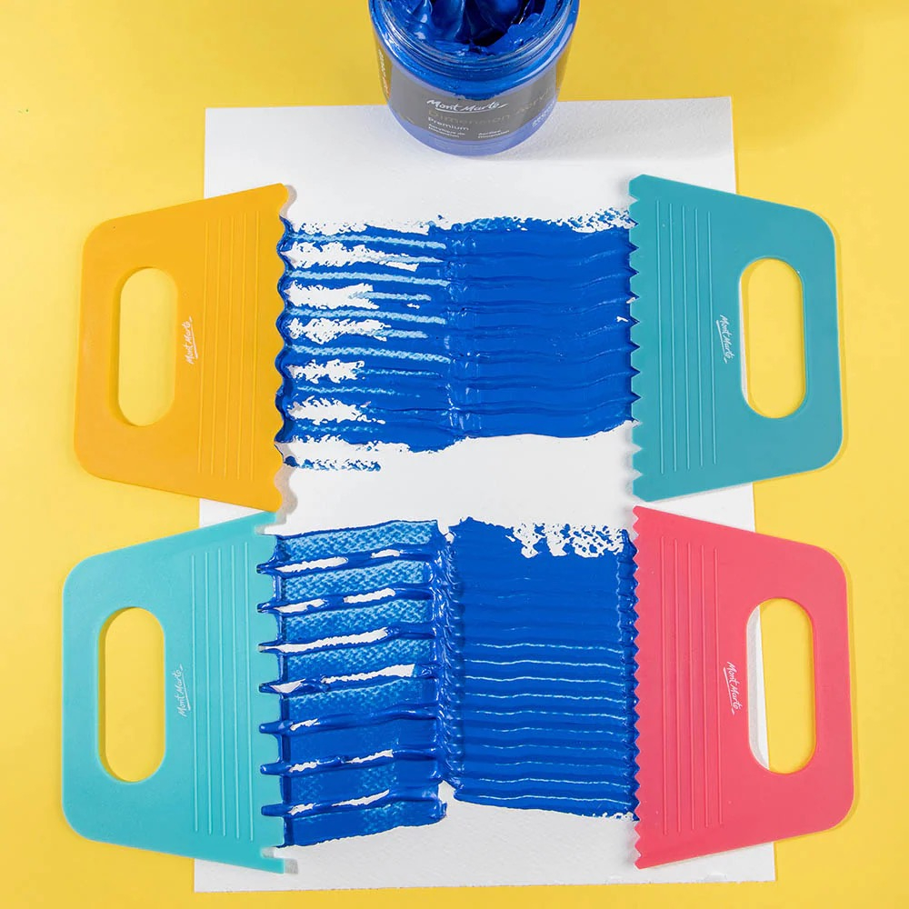 Setul de șpacluri pentru textură Mont Marte este ideal pentru aplicarea și modelarea pastelor acrilice, a gelurilor, gesso-ului sau a altor mediumuri dense 🎨🖌️.