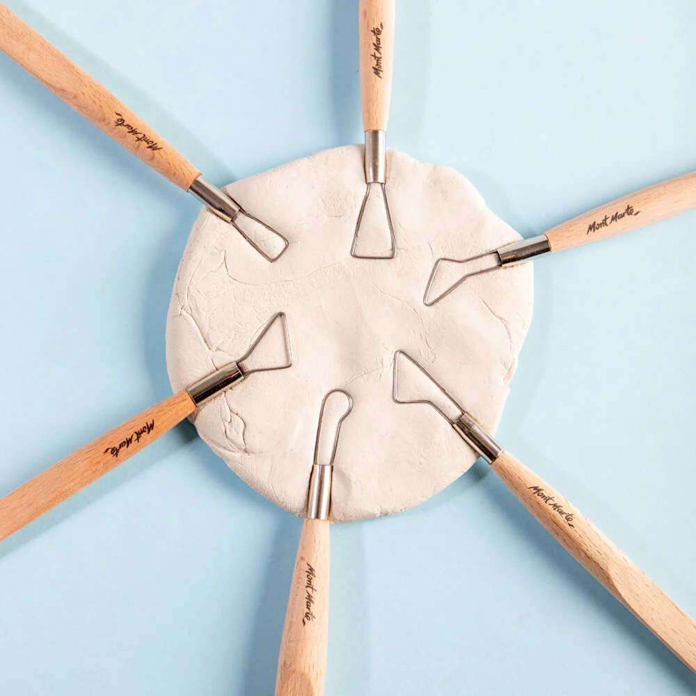 Setul de unelte pentru lut Mont Marte include 6 instrumente esențiale pentru modelare, sculptură și detalii precise în proiectele creative. Concepute pentru a fi ușor de utilizat, acestea permit realizarea de forme complexe și finisaje fine 🎨🖐️.