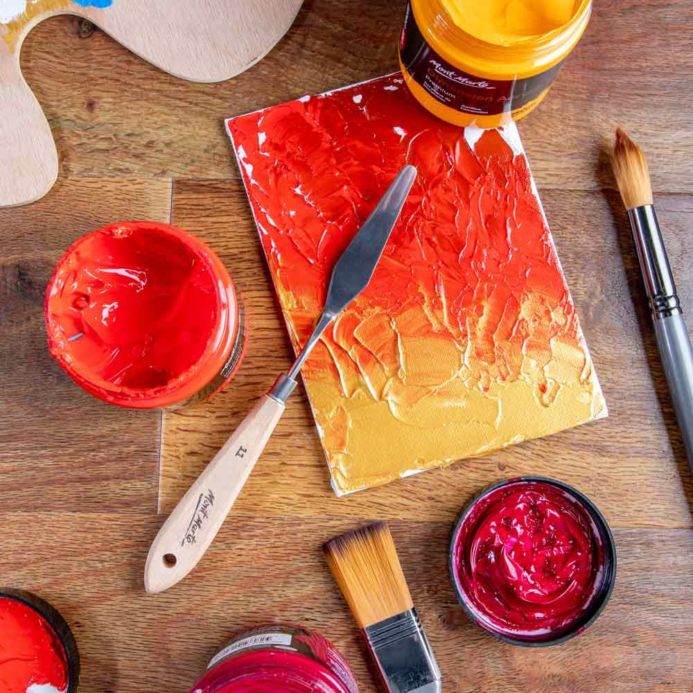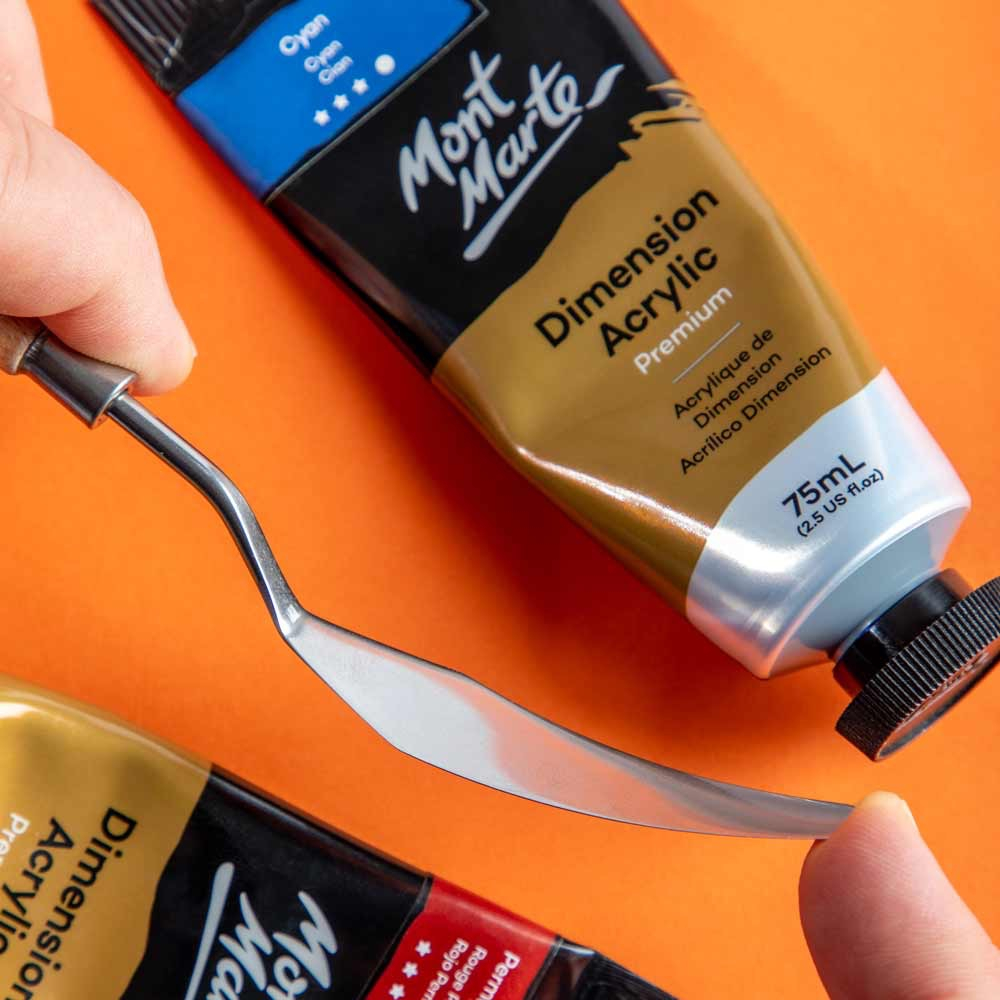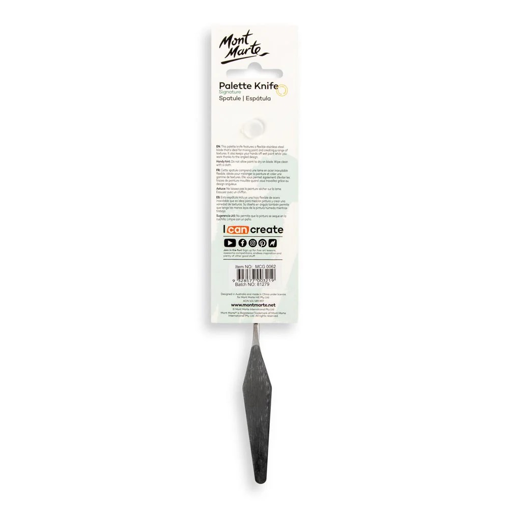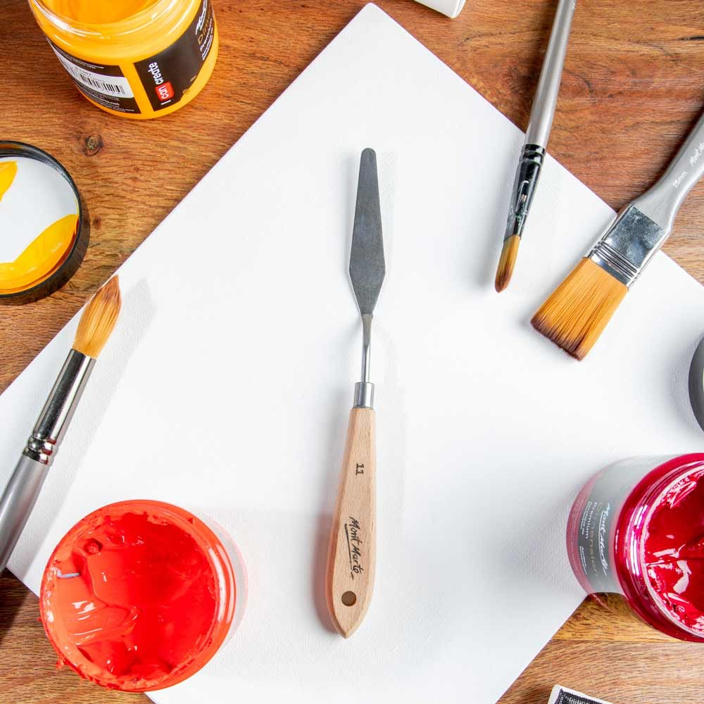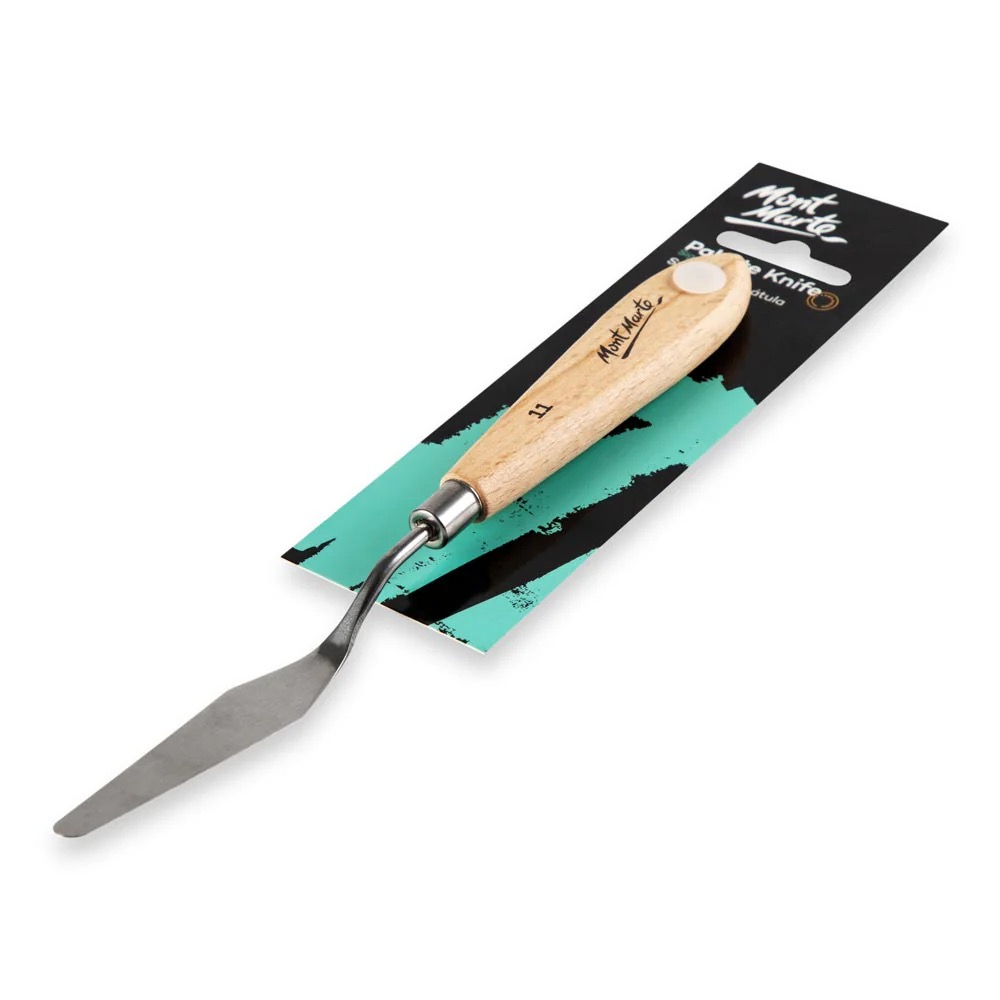 Cuțitul de pictură nr. 11 Mont Marte este destinat aplicării vopselei în straturi foarte mari și pentru crearea de texturi dramatice în tehnica impasto. Lama metalică flexibilă permite întinderea uniformă a vopselei și realizarea efectelor de relief vizibile 🎨🔪.