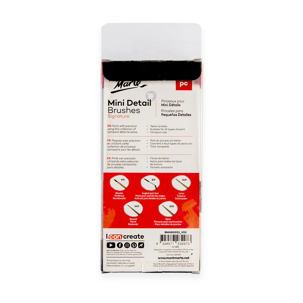 Setul Mont Marte cu 5 pensule pentru detalii este conceput pentru artistii care doresc control fin si precizie in fiecare linie 🎨🖌️. Forma si marimea perilor permit trasarea detaliilor delicate, contururilor si finisajelor subtile, fiind ideale pentru pictura acrilica, acuarela sau guase.