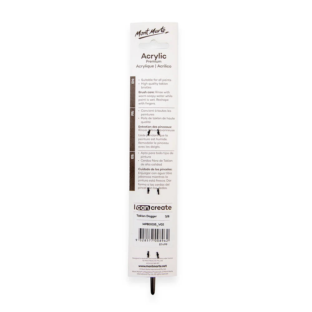 Pensula Mont Marte taklon tip cutit 3/8 este ideala pentru aplicari controlate si efecte expresive. Forma plata, cu varf drept, permite trasarea unor linii ferme, margini clare si incarcarea uniforma a culorii. Potrivita pentru acrilic, acuarela sau alte medii pe baza de apa. 🎨🖌️